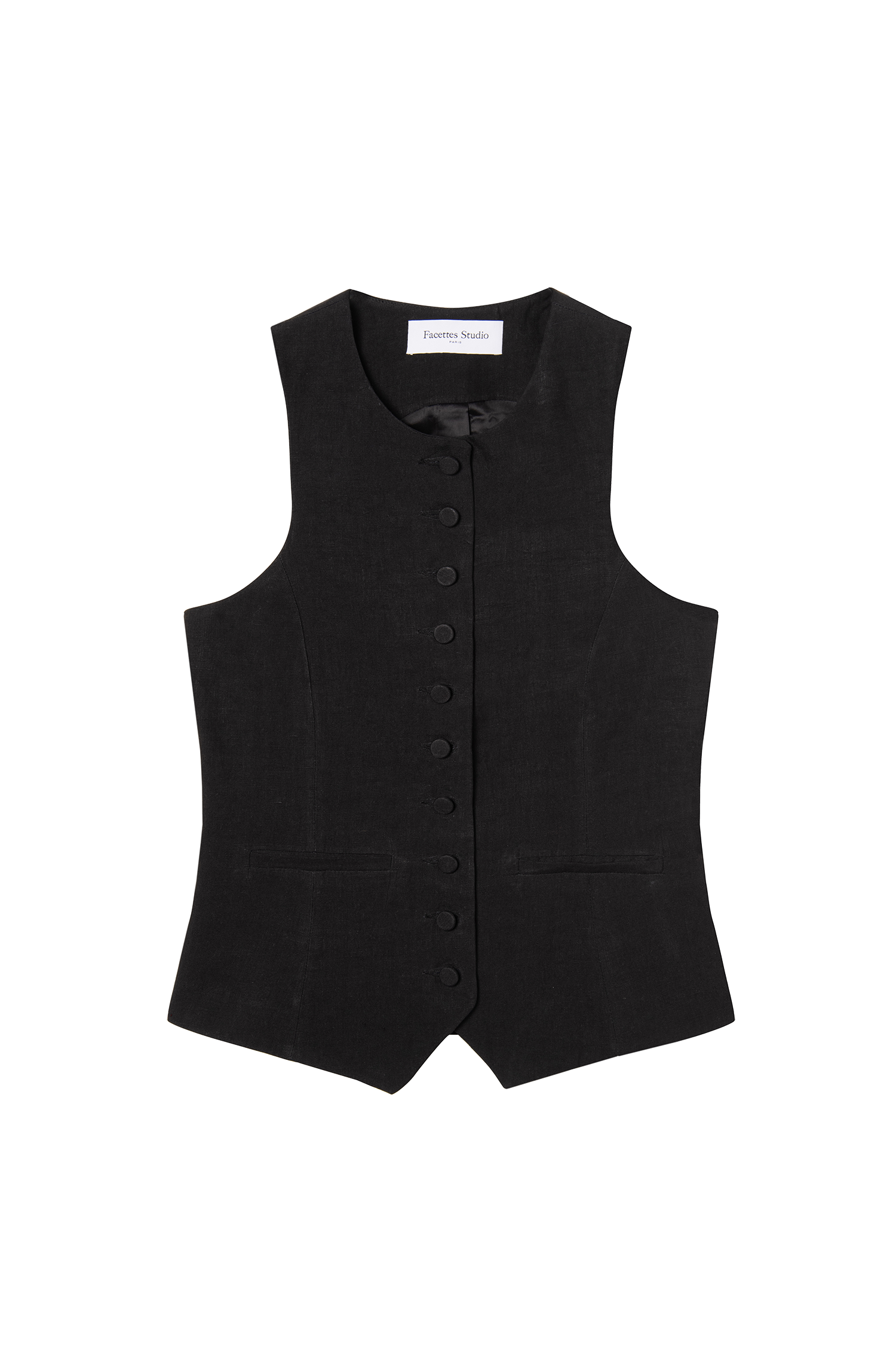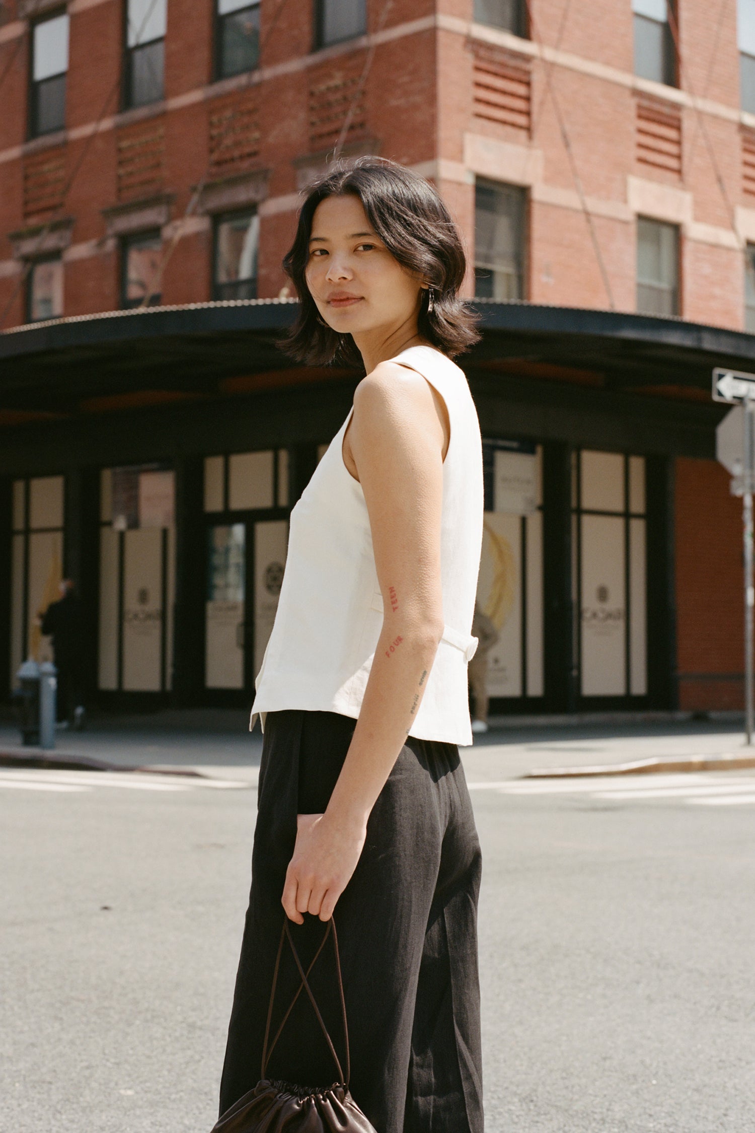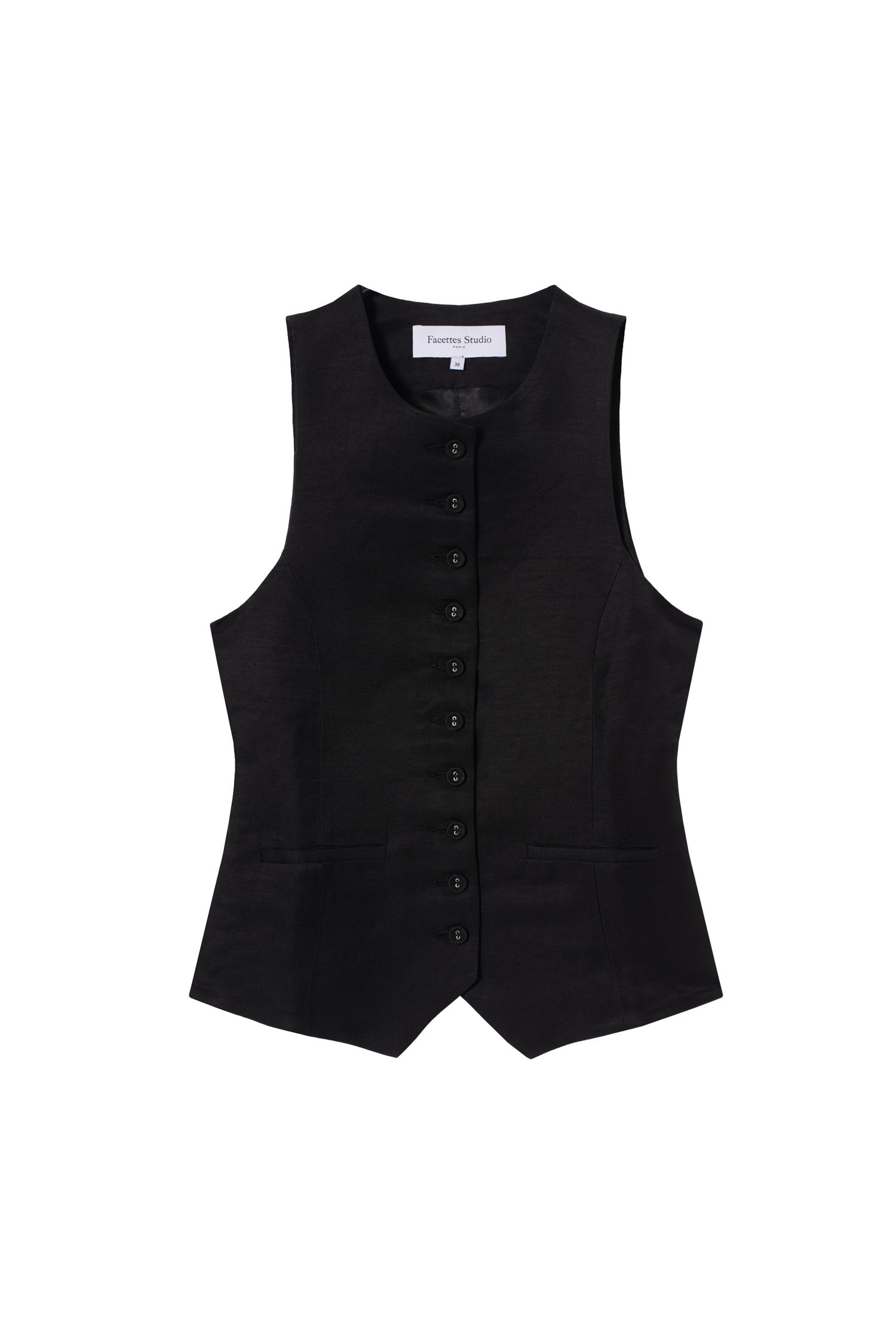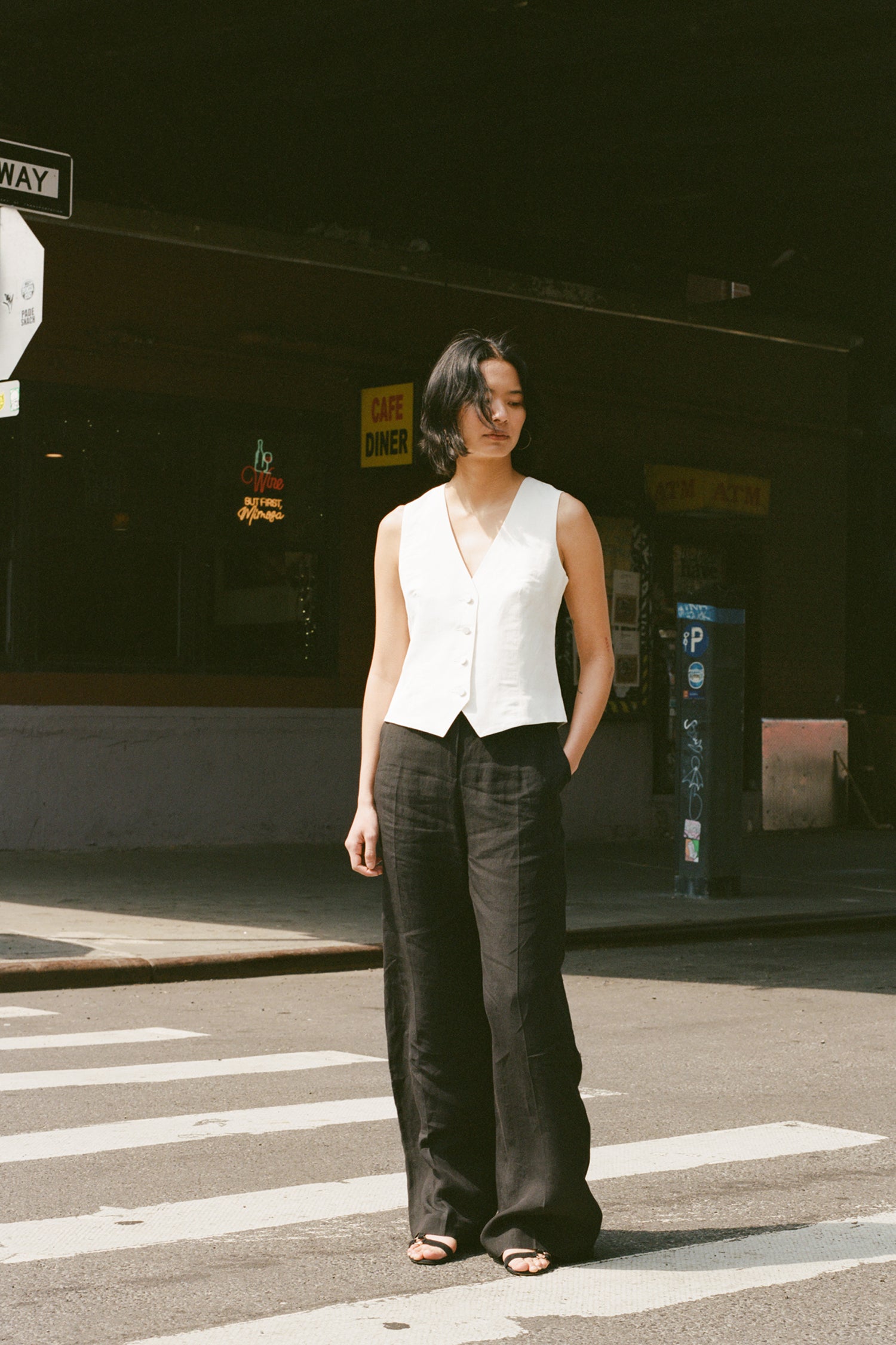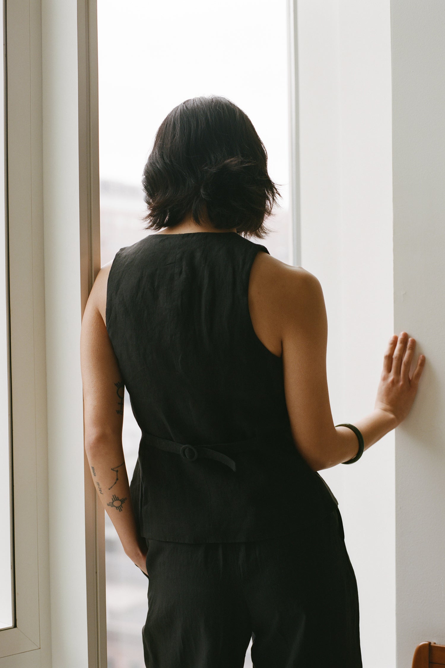 Pour une silhouette estivale structurée sans effort, le pantalon de tailleur en lin s’associe naturellement à un gilet sans manches, porté à même la peau ou sur un débardeur minimal. On peut aussi opter pour un ensemble noir en laine légère, une alternative raffinée pour les journées chaudes comme les soirées d’été.