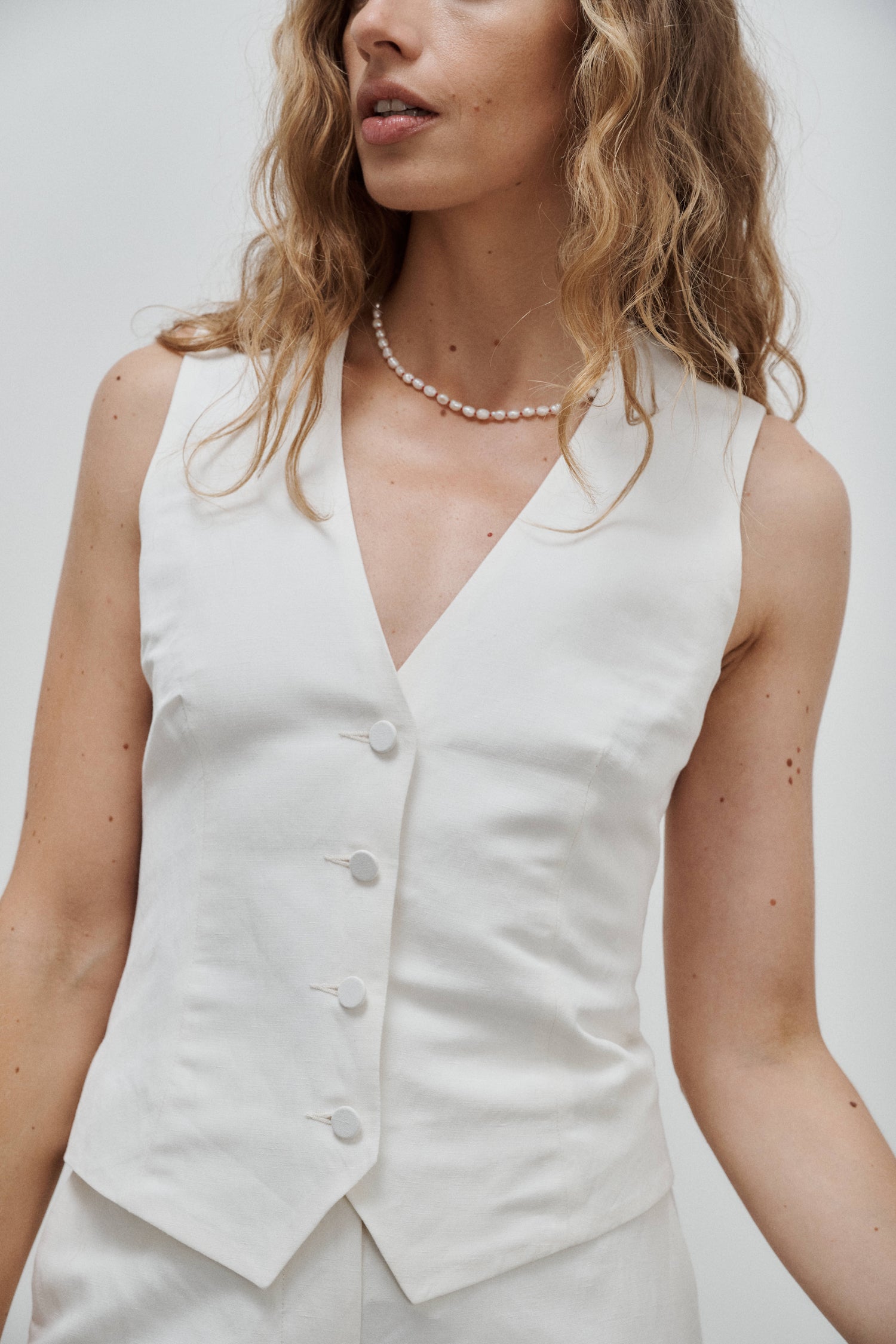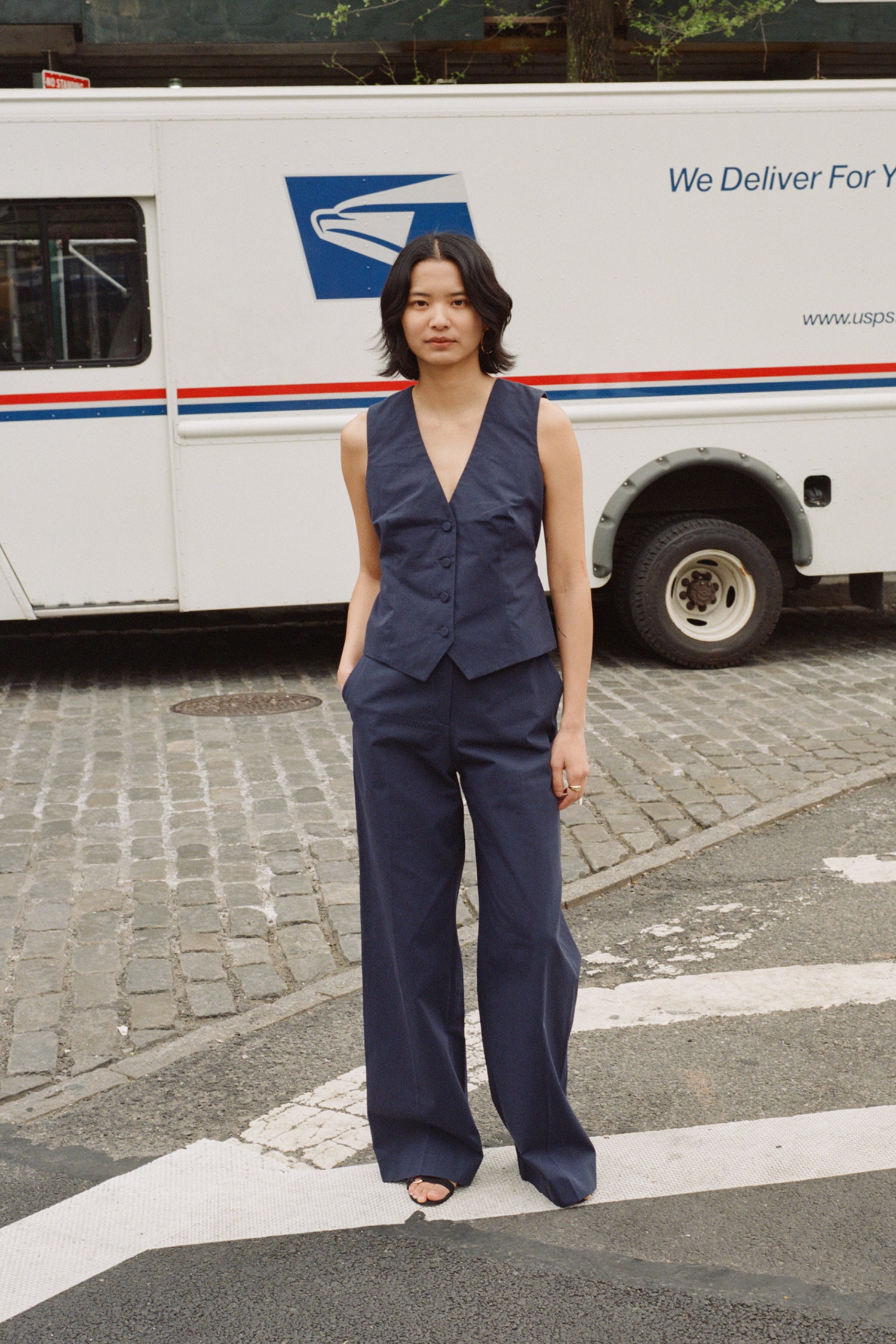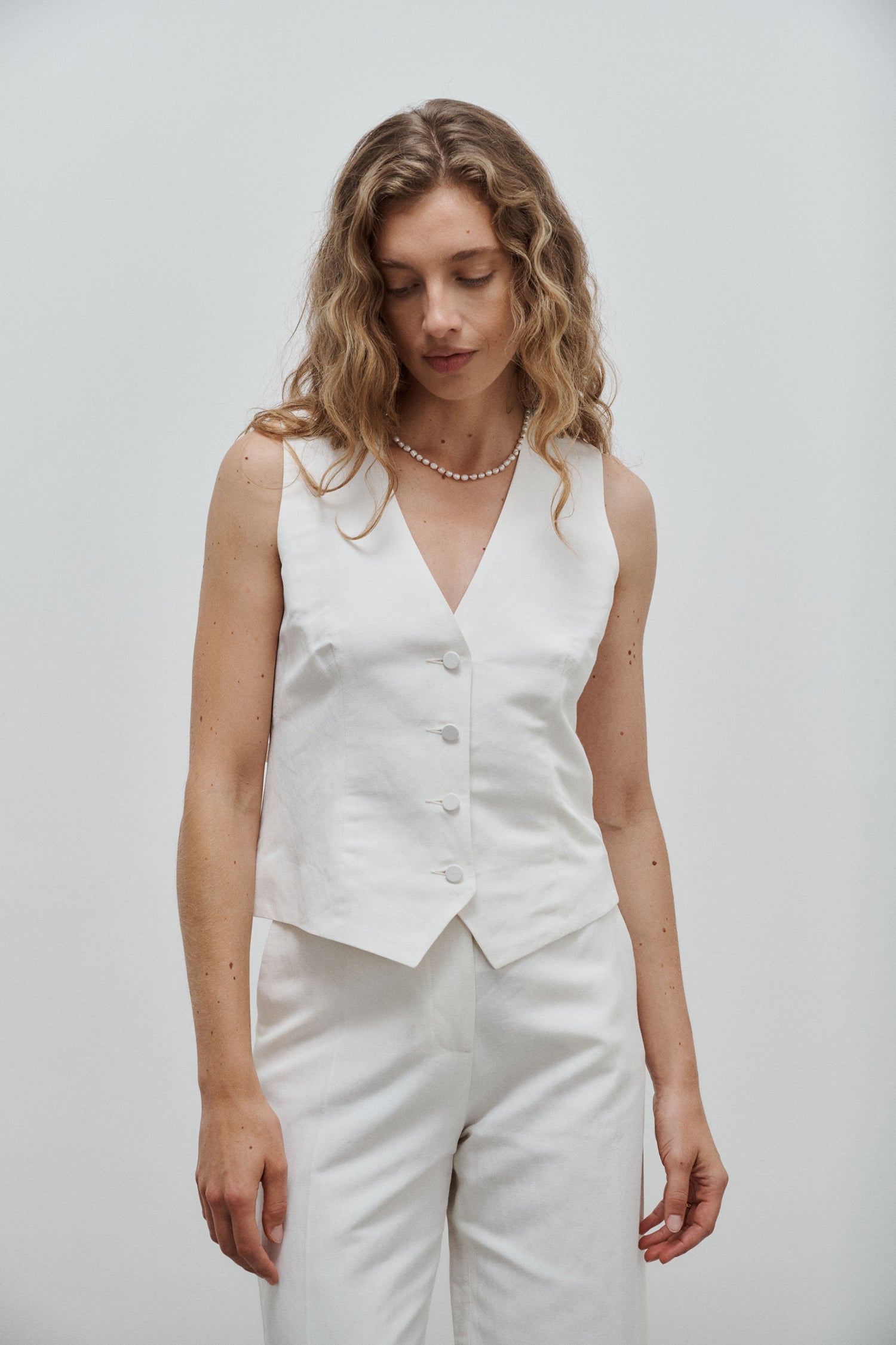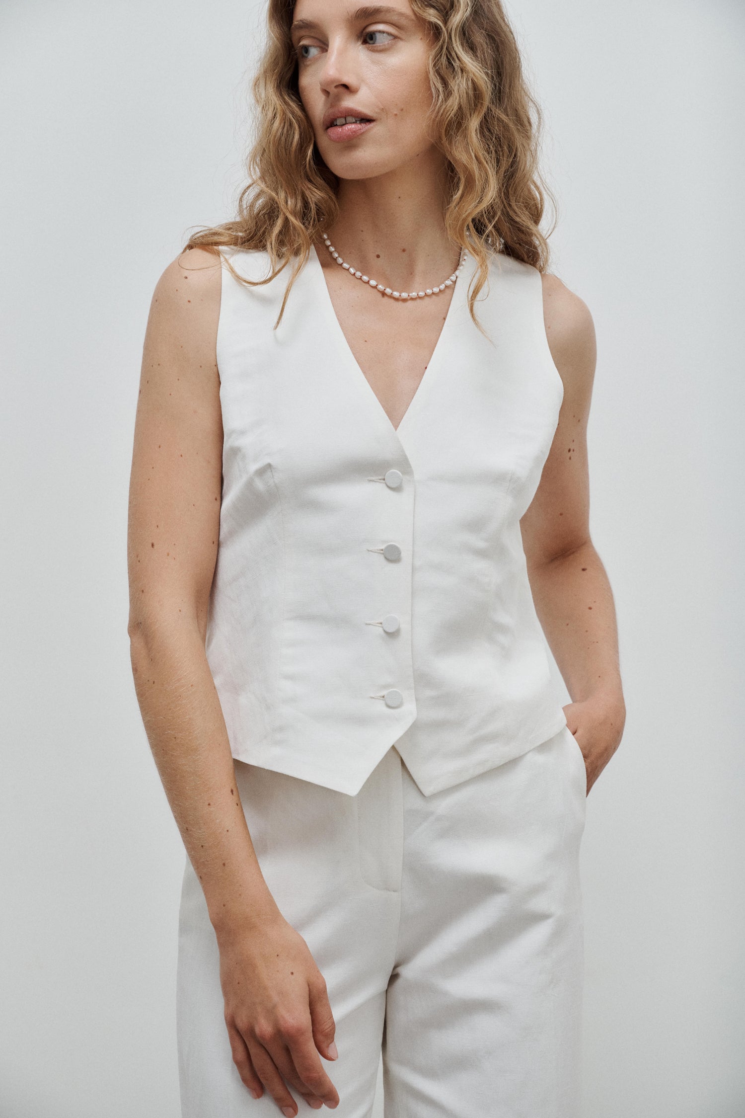 Pour une silhouette estivale structurée sans effort, le pantalon de tailleur en lin s’associe naturellement à un gilet sans manches, porté à même la peau ou sur un débardeur minimal. On peut aussi opter pour un ensemble noir en laine légère, une alternative raffinée pour les journées chaudes comme les soirées d’été.