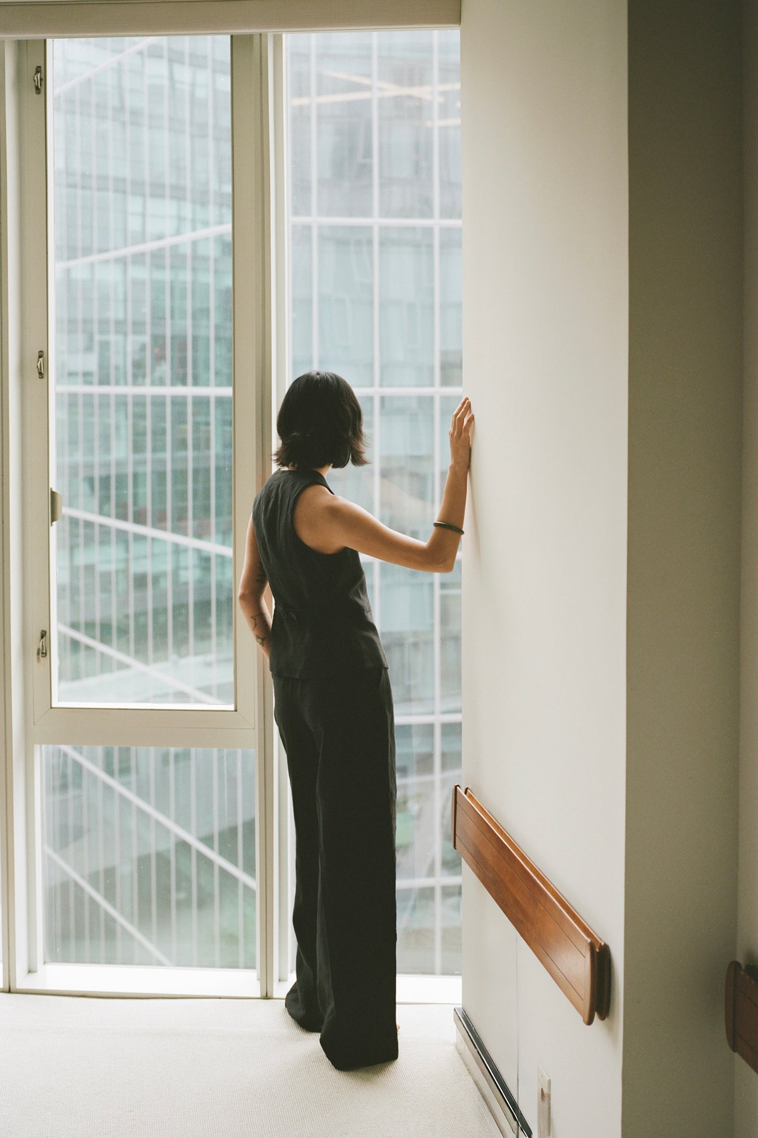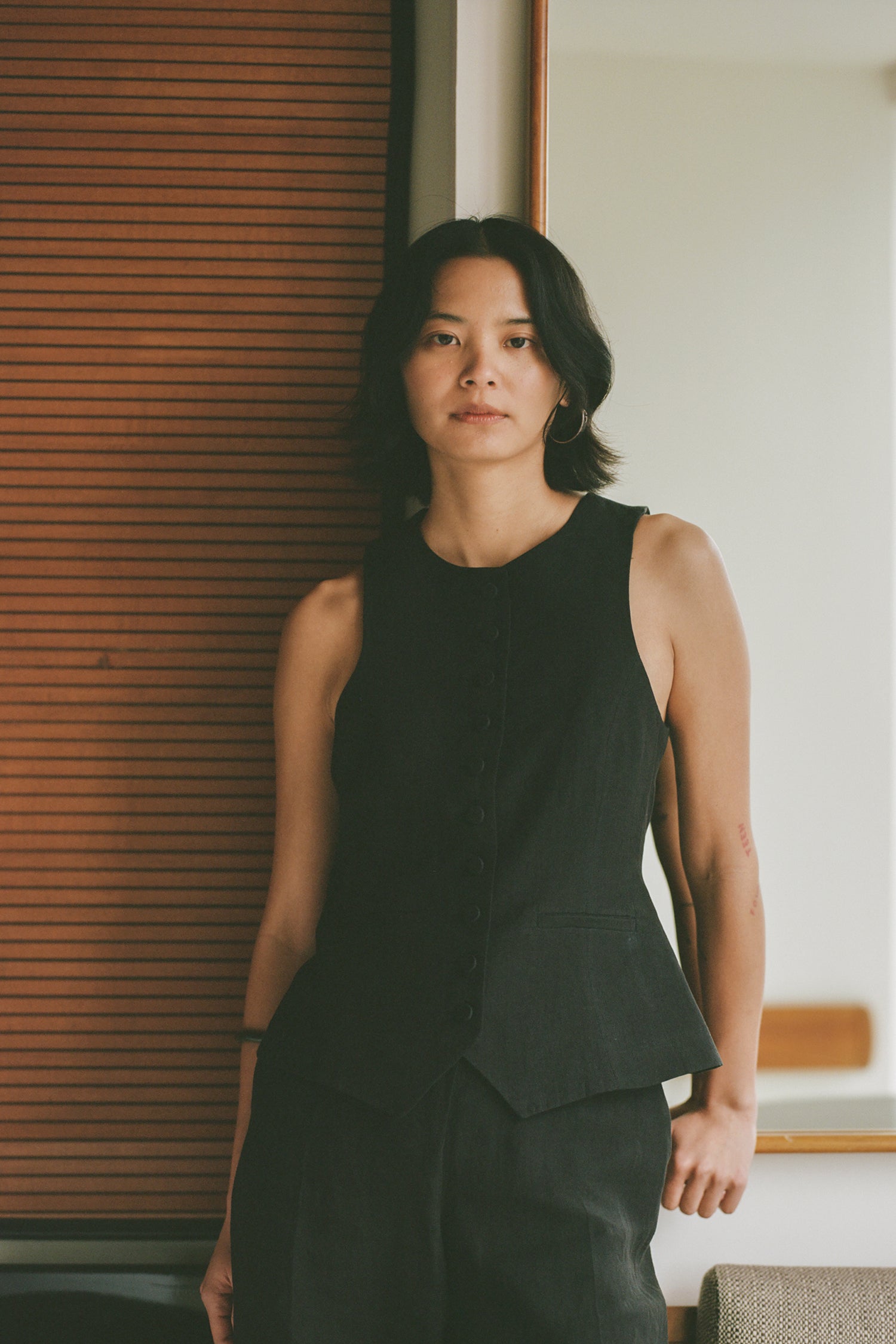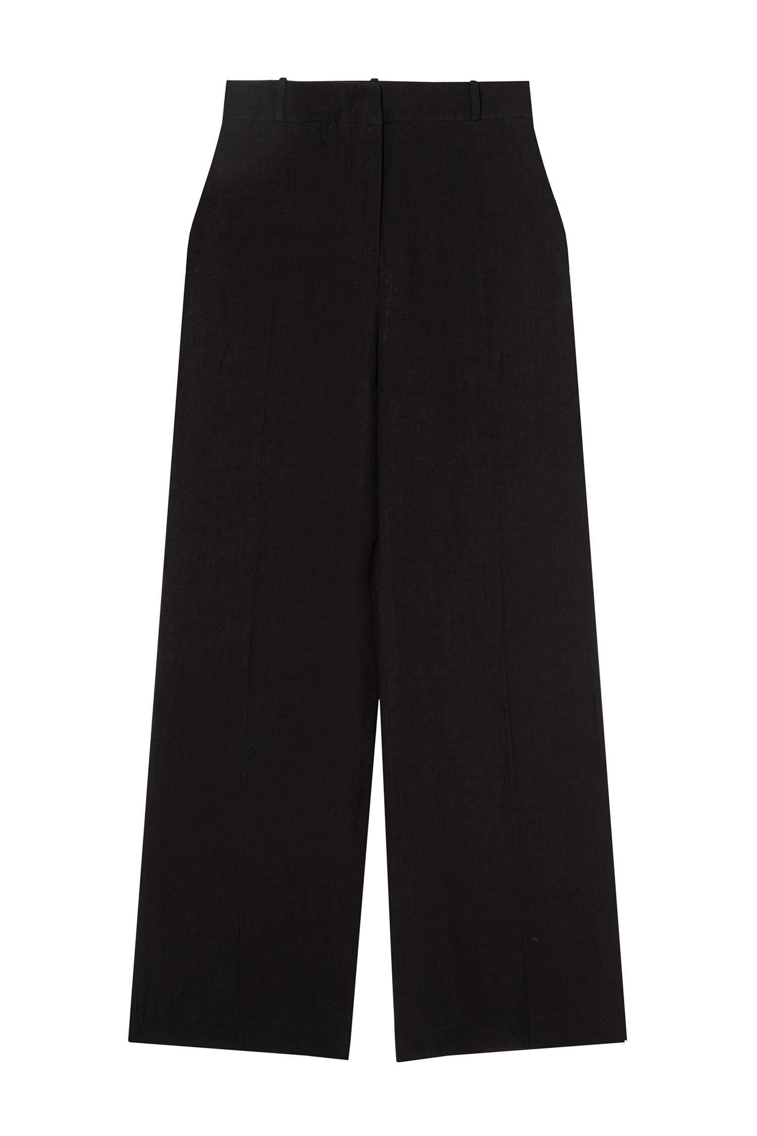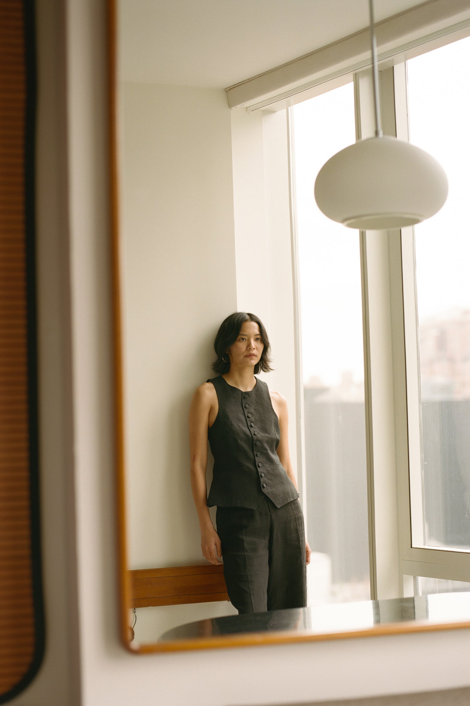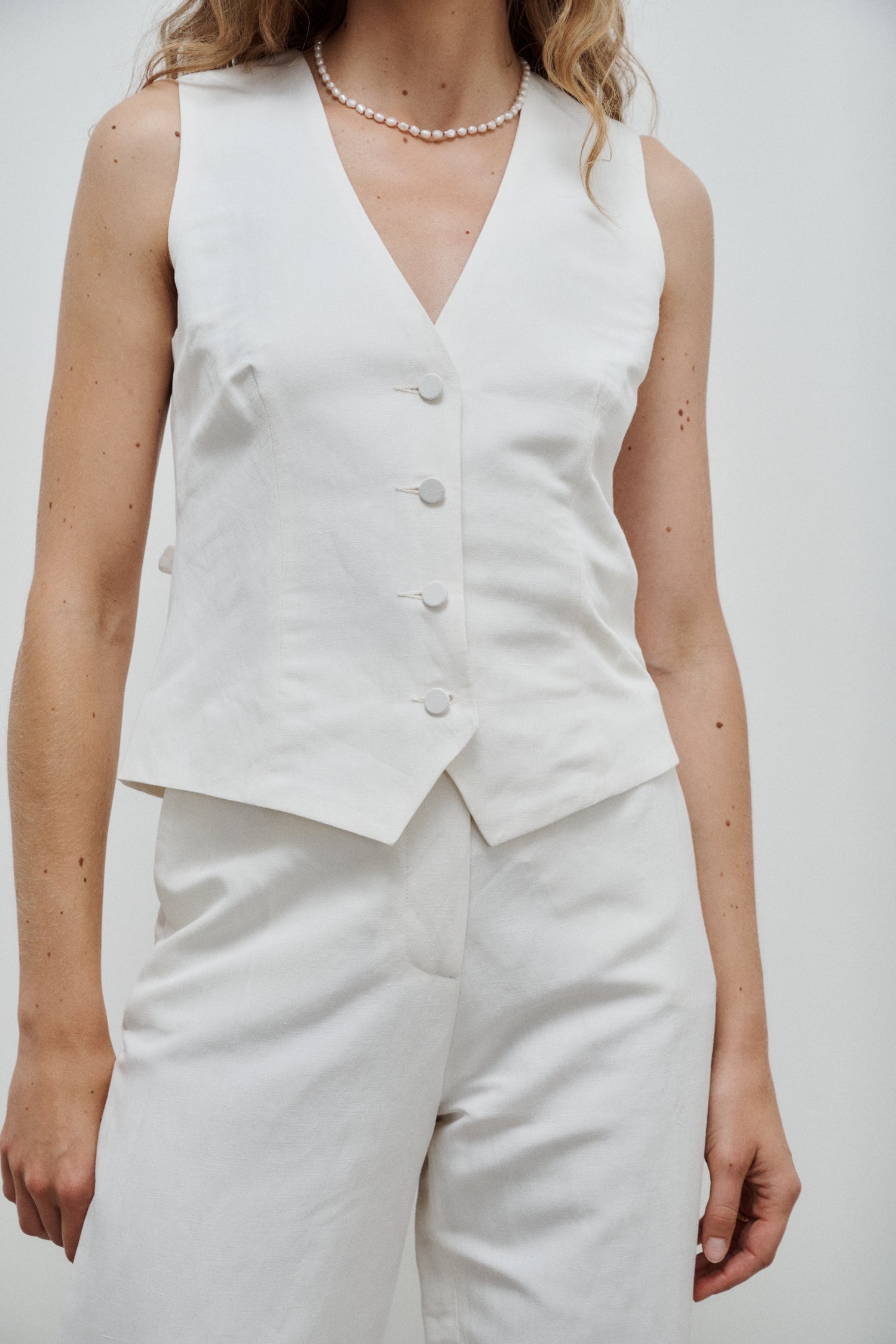 Pour une silhouette estivale structurée sans effort, le pantalon de tailleur en lin s’associe naturellement à un gilet sans manches, porté à même la peau ou sur un débardeur minimal. On peut aussi opter pour un ensemble noir en laine légère, une alternative raffinée pour les journées chaudes comme les soirées d’été.