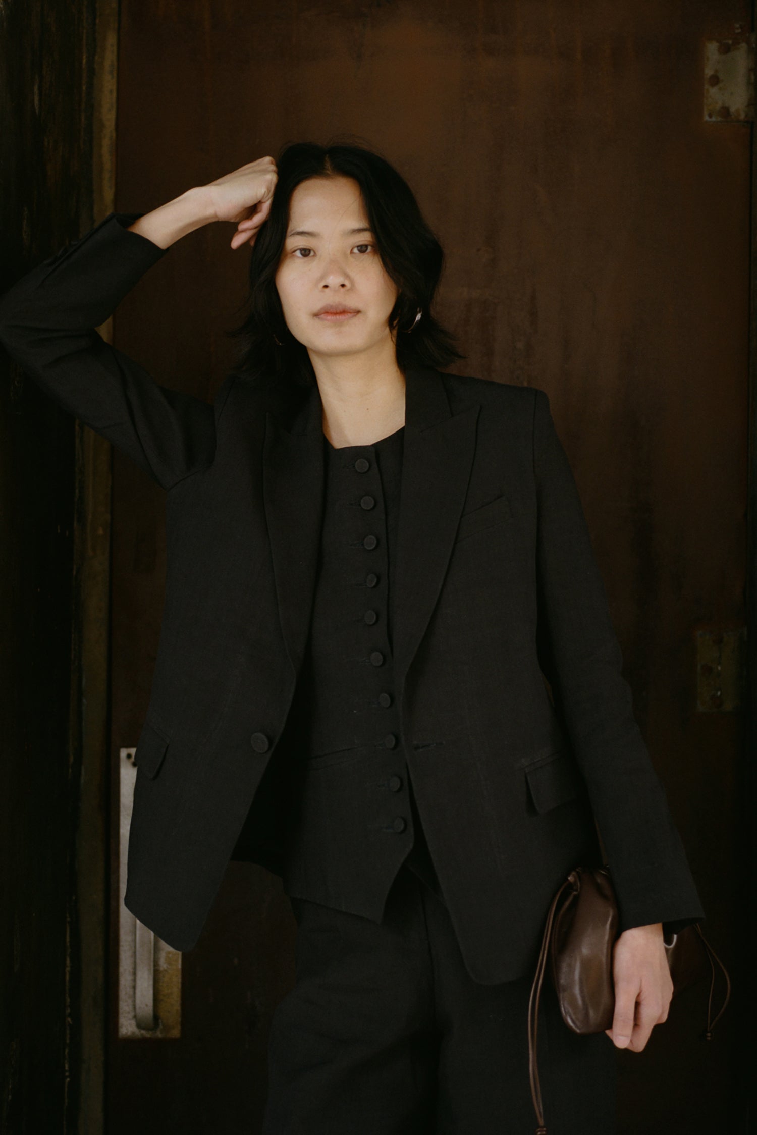 L’exigence des coupes s’accompagne d’un soin particulier porté aux matières réemployées, véritable cœur de cette collection. Les tailleurs sont réalisés dans des tissus respirants, haut de gamme et éco-responsables, comme le lin naturel certifié GOTS, texturé et élégant, qui traverse la saison avec un tombé sec et une allure vivante. Nos blazers d’été et pantalons légers se déclinent également en laine fraîche, twill de laine ou coton naturel, selon les modèles, pour accompagner le corps sans jamais l’alourdir. Toutes les matières sont rigoureusement sélectionnées pour leur qualité, leur tombé, leur confort et leur durabilité, mais aussi pour leur impact environnemental. Réalisées à partir de fibres naturelles, biologiques et toutes issues de stocks dormants de maisons de luxe, elles incarnent une démarche exigeante mêlant responsabilité et style élégant.
