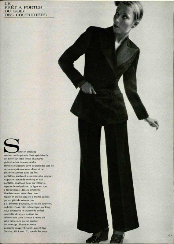 Gabrielle Chanel challenged this, proposing elegant tailoring that remained comfortable, using soft fabrics like jersey and tweed. In the 60s, tailoring evolved again: Courrèges introduced futuristic silhouettes, while Yves Saint Laurent created the iconic women's tuxedo, the smoking, directly inspired by men’s eveningwear.