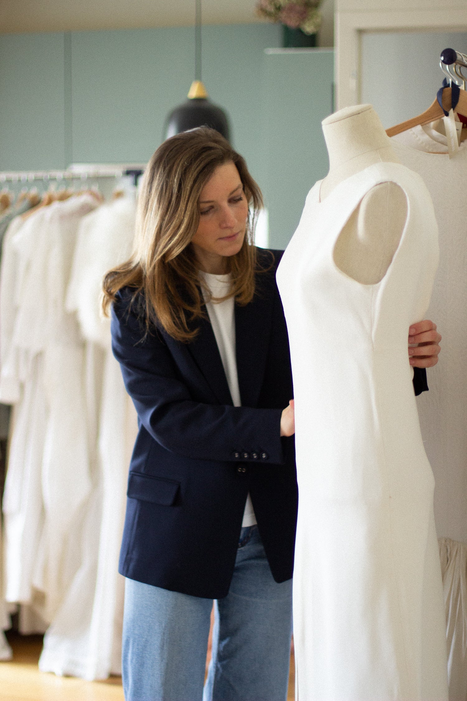 "I wear high-waisted, loose jeans every day with a little shirt (often vintage). To dress it all up, I always have a little jacket that I put on top."