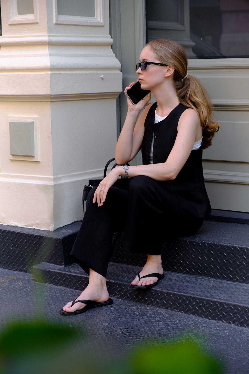 Sarah is wearing the monica vest and bianca pants black linen set.