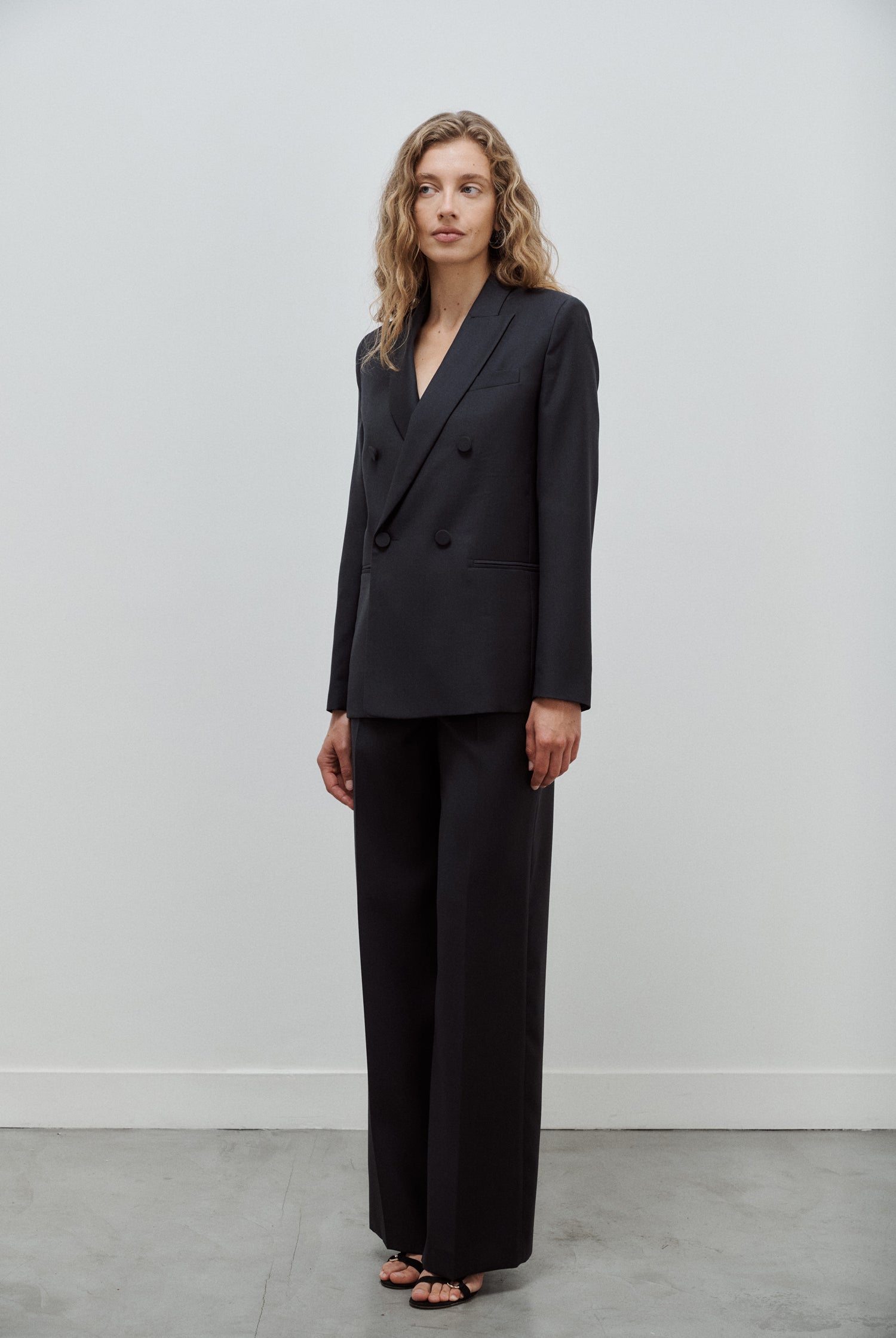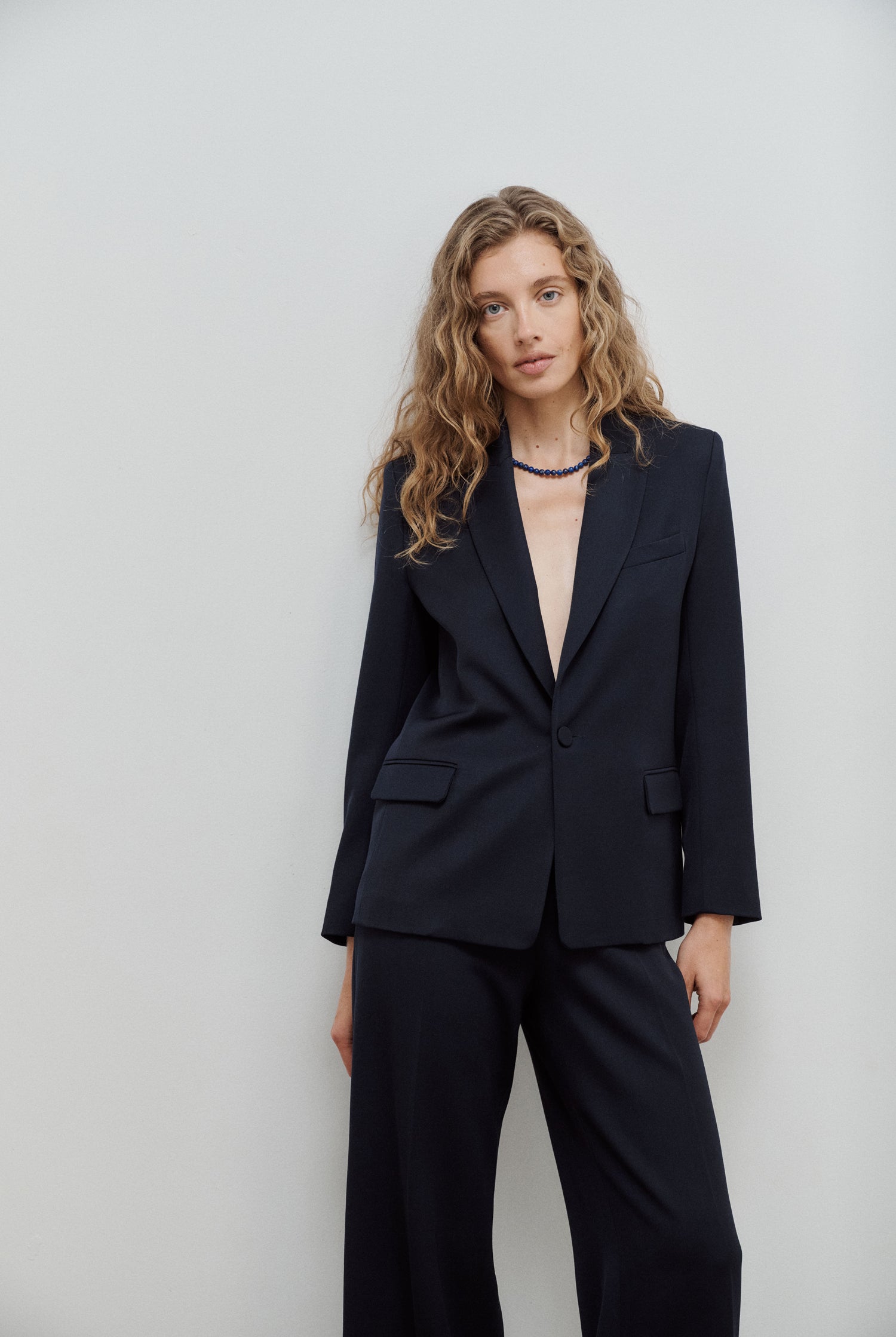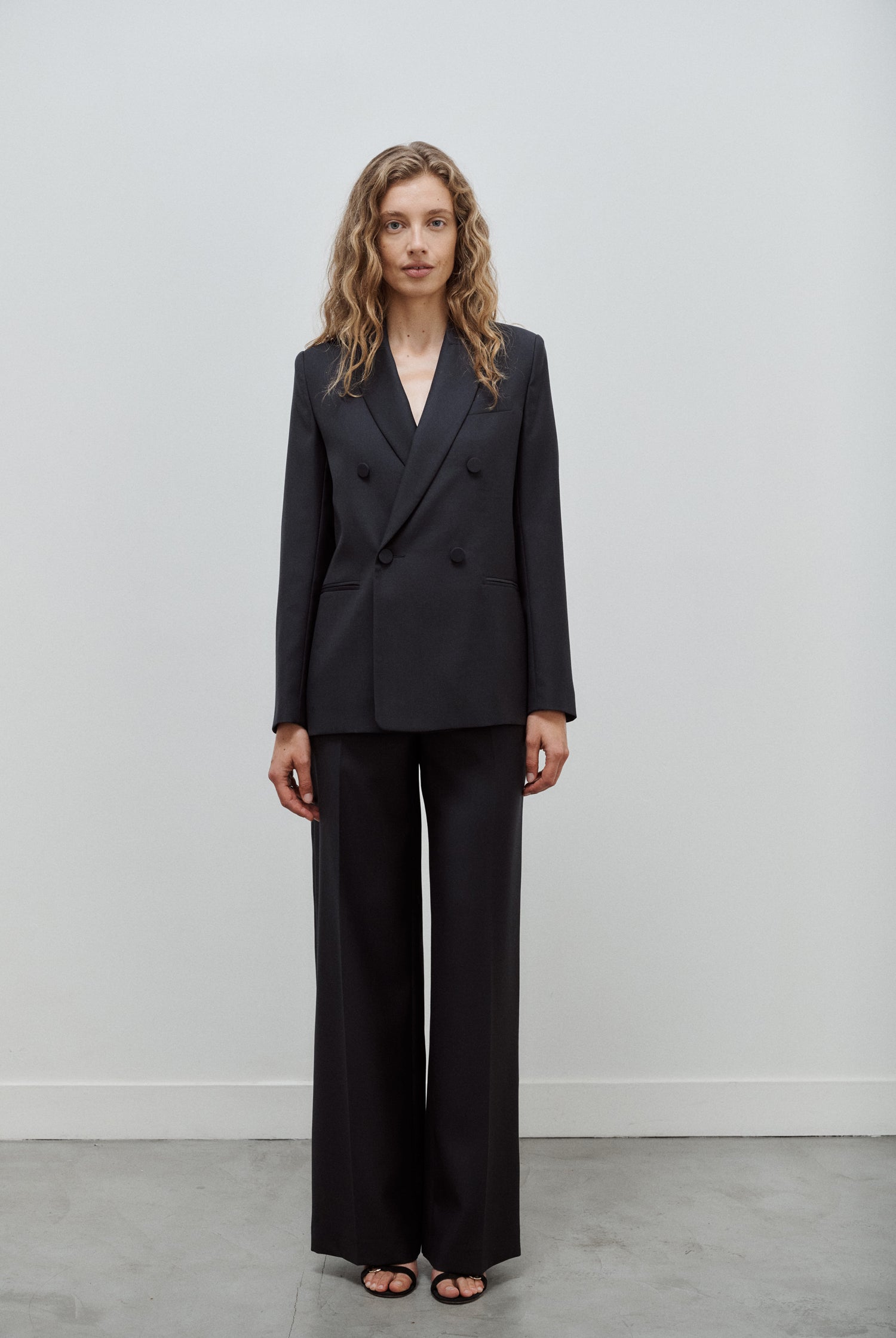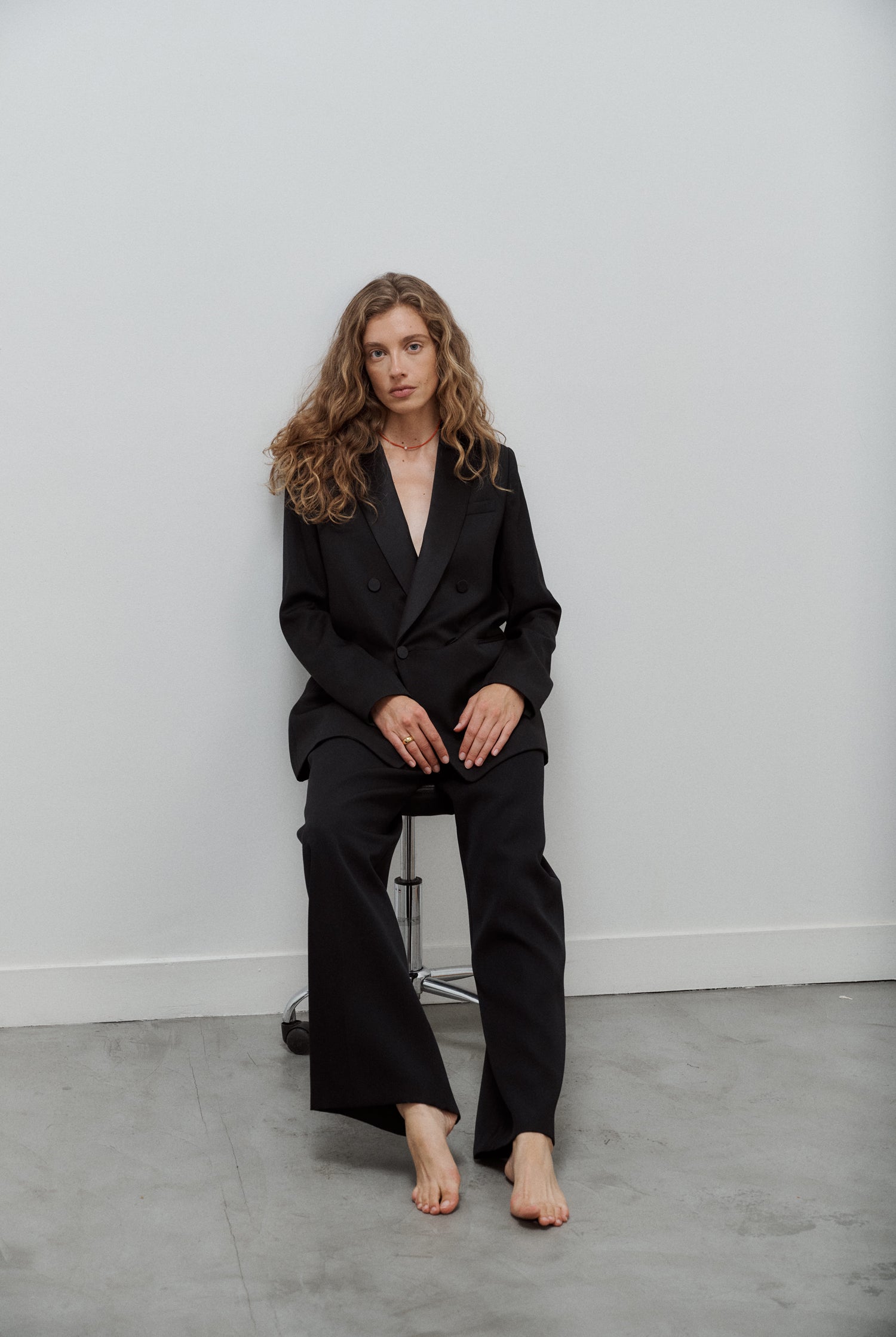 Worn as a separate blazer or paired with matching pants for a pantsuit, the jacket is a true wardrobe staple for women. Available in navy blue, black, and beige wool gabardine or black wool twill, our matching sets are essentials that can be worn all year round and will stand the test of time, regardless of fashion trends.