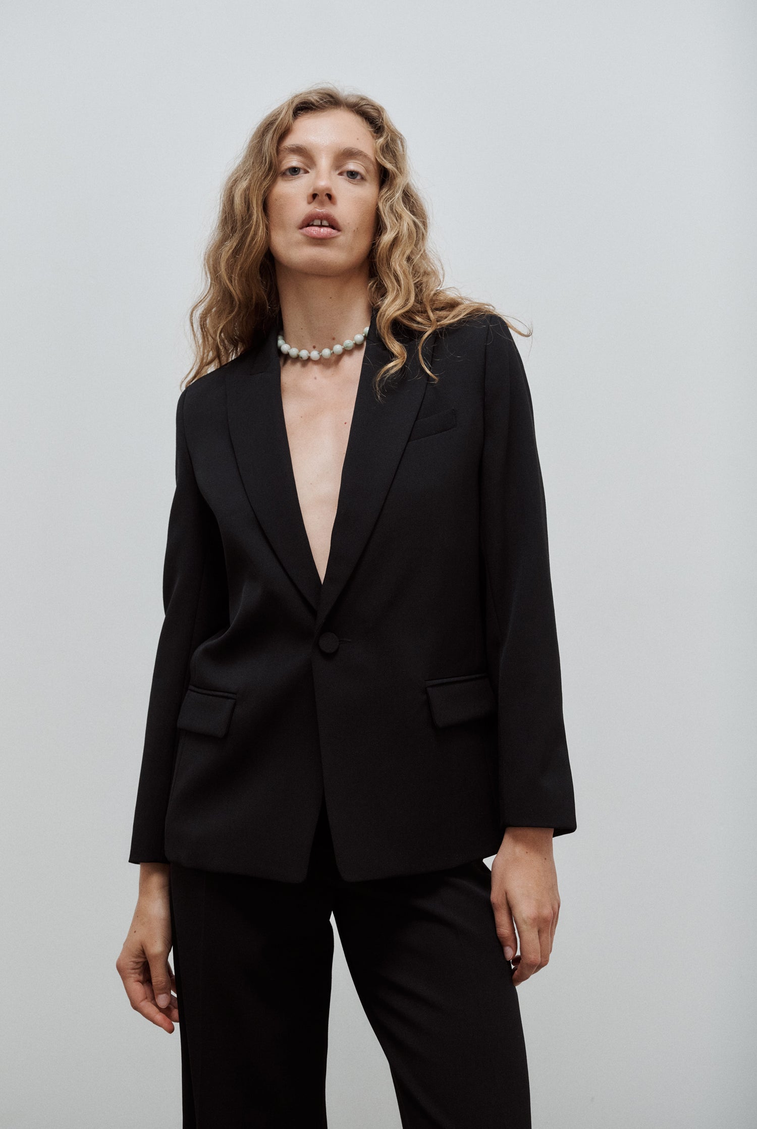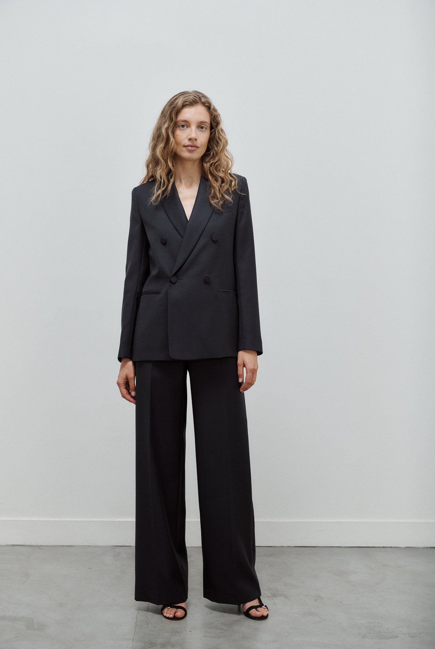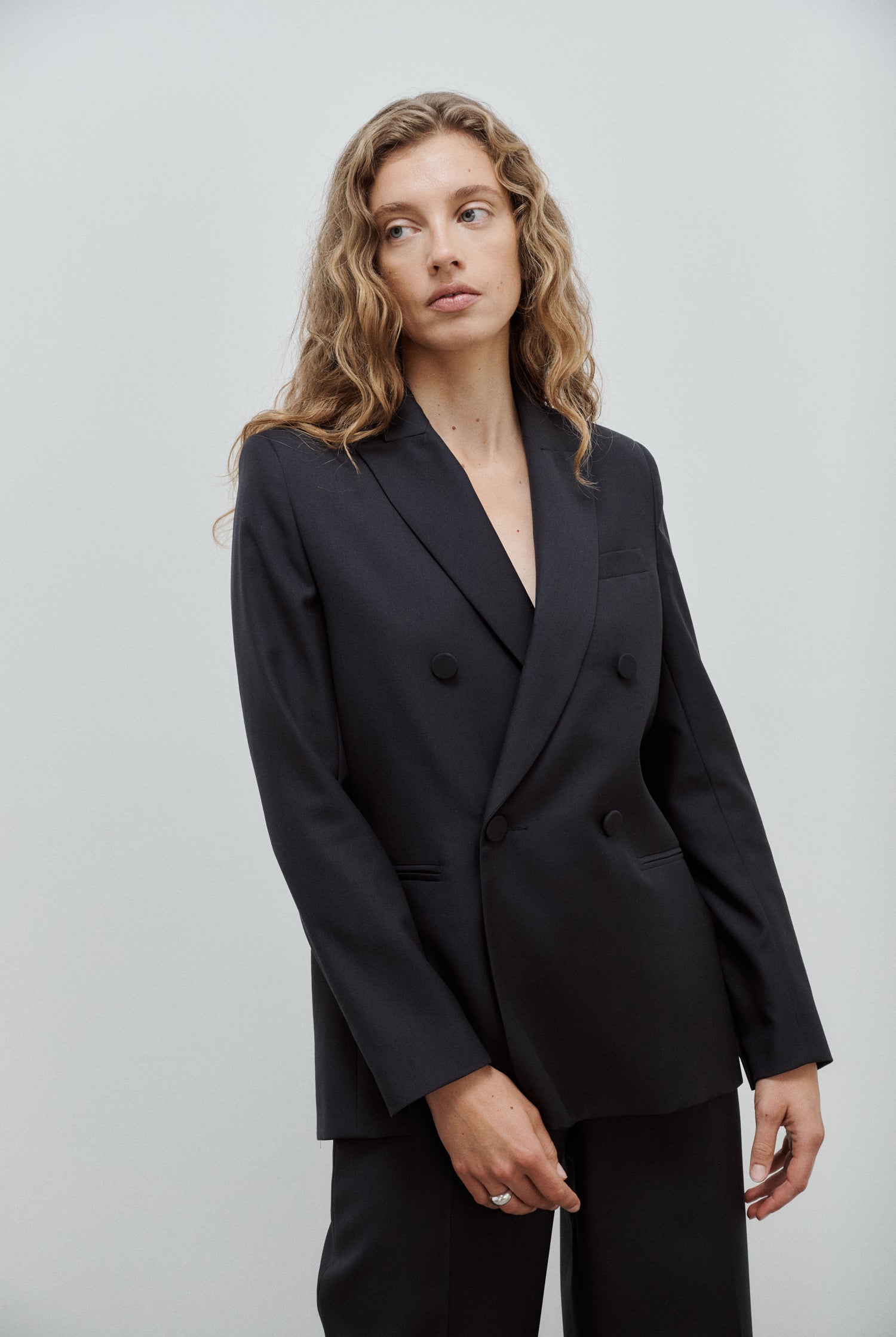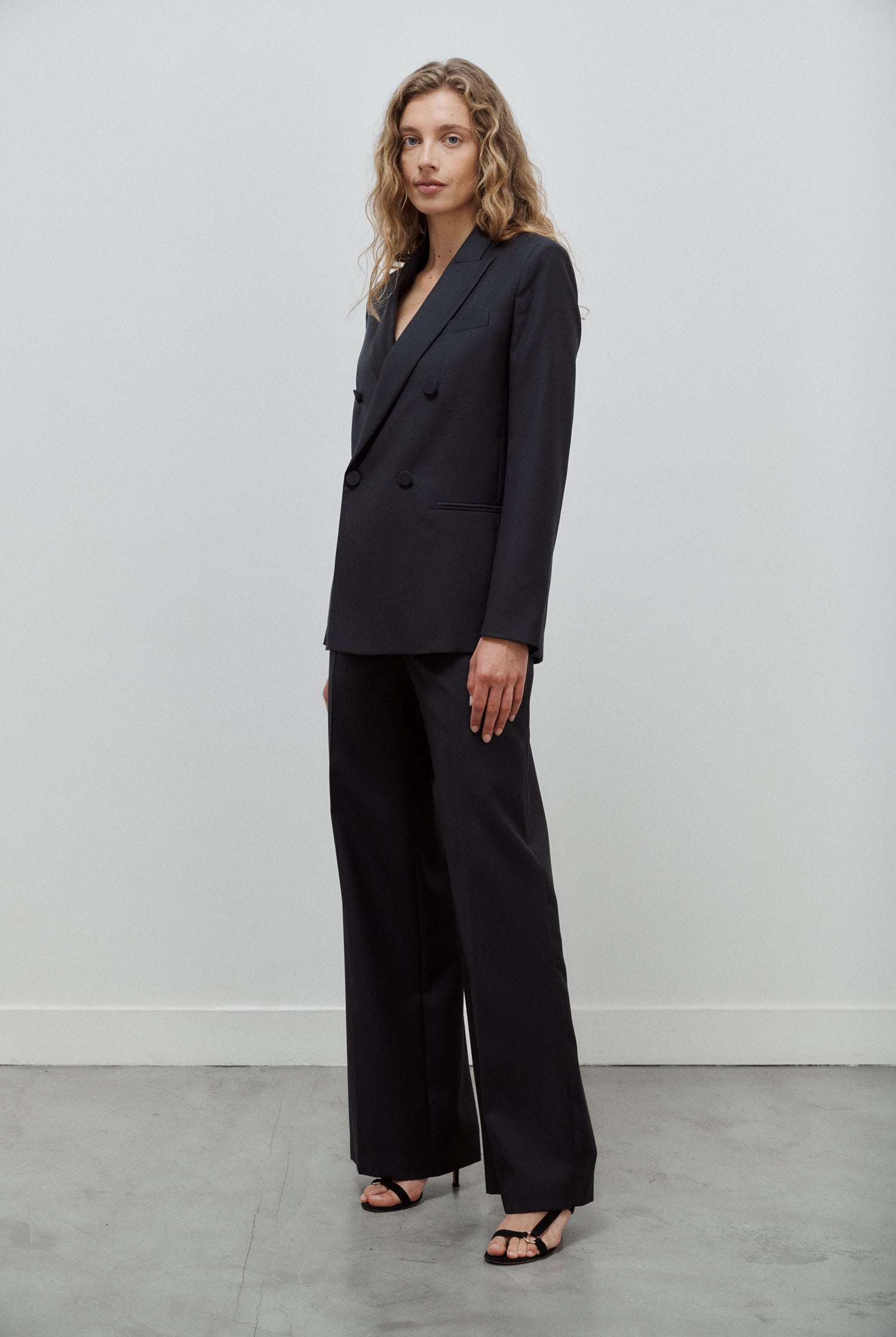 Worn as a separate blazer or paired with matching pants for a pantsuit, the jacket is a true wardrobe staple for women. Available in navy blue, black, and beige wool gabardine or black wool twill, our matching sets are essentials that can be worn all year round and will stand the test of time, regardless of fashion trends.